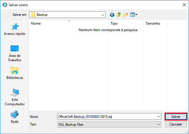 IMPORTANTE: Note que o nome do arquivo é composto pela expressão OfficerSoft Backup, seguido pela data (no formato AAAAMMDD) e hora (no formato HHMM) de realização do BACKUP. Desta forma você poderá localizar o mesmo com maior facilidade para a análise da higidez e em casos de uma restauração futura.