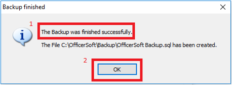 1.7. Conforme a imagem abaixo, ao finalizar a realização do BACKUP, será apresentada a mensagem The Backup was finished successfully (1), informando que o mesmo foi finalizado com sucesso, após é só clicar em OK (2) para finalizar.