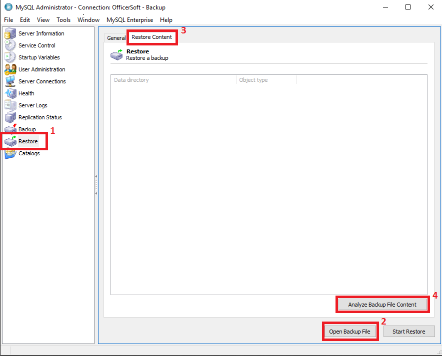 2.1. Ainda no aplicativo Officer Soft Backup, acessar o item Restore (1), localizado no menu lateral esquerdo e em seguida clique no botão Open Backup File (2) localizado no canto inferior direito para selecionar o arquivo de BACKUP (selecione o arquivo referente ao BACKUP anteriormente realizado). Na sequência acessar na aba Restore Content (3). Inicie em seguida a análise da sua higidez, clicando no botão Analyze Backup File Content (4).