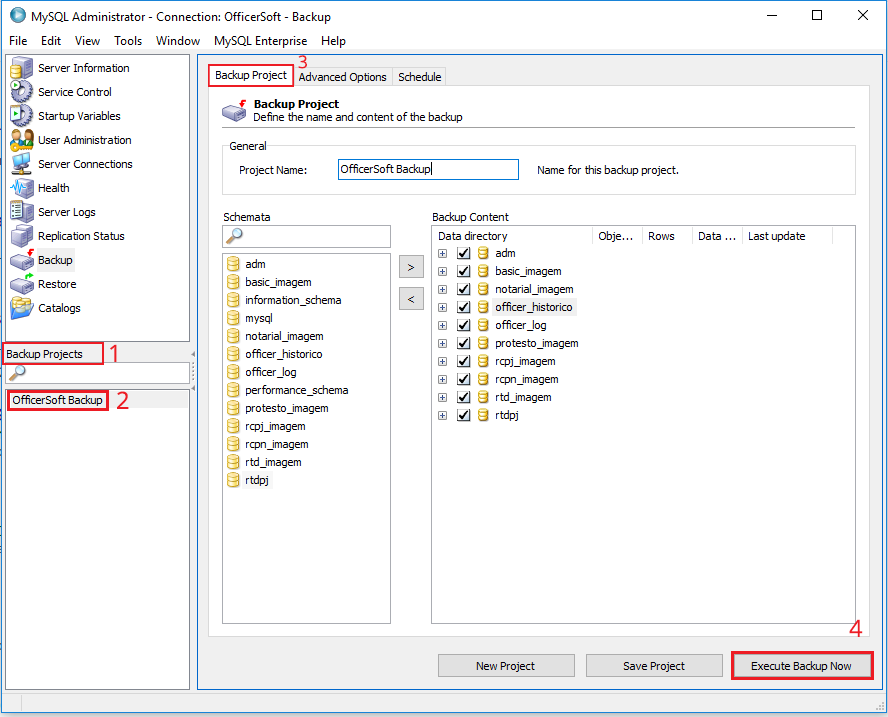 1.4. Conforme a imagem apresentada abaixo, na área de Backup Projects (1) no canto inferior esquerdo, selecionar o projeto OfficerSoft Backup (2) e aguardar alguns segundos para que sejam carregadas as informações do banco de dados na aba Backup Project (3) localizada na lateral direita da janela. Em seguida, iniciar a realização do BACKUP clicando na opção Execute Backup Now (4).