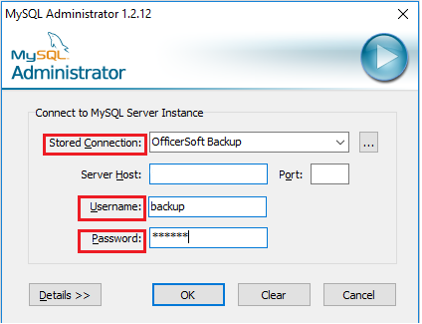 1.2. Confirmar o acesso ao aplicativo OfficerSoft Backup, verificando se as informações destacadas em vermelho estão preenchidas, conforme apresentado na imagem abaixo, caso contrário, contatar a equipe de serviços da Officer Soft para configurar o mesmo.